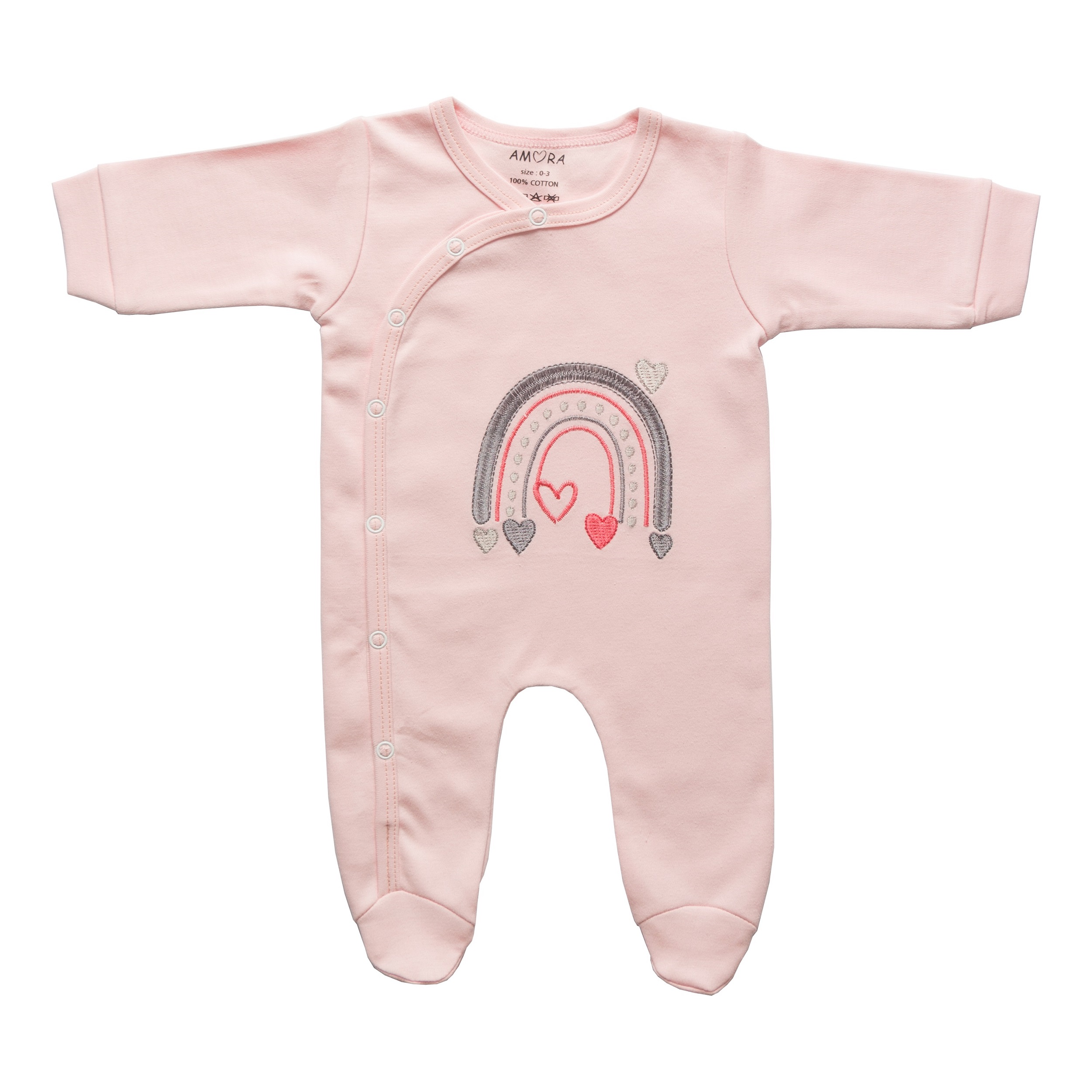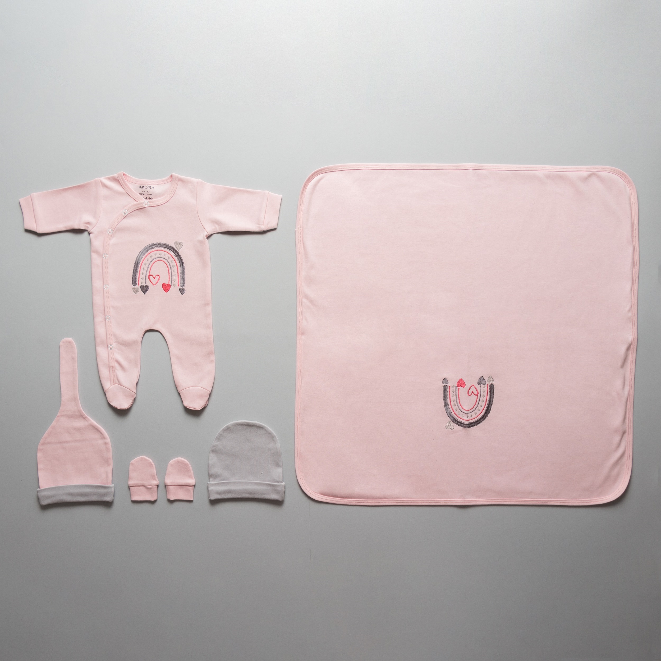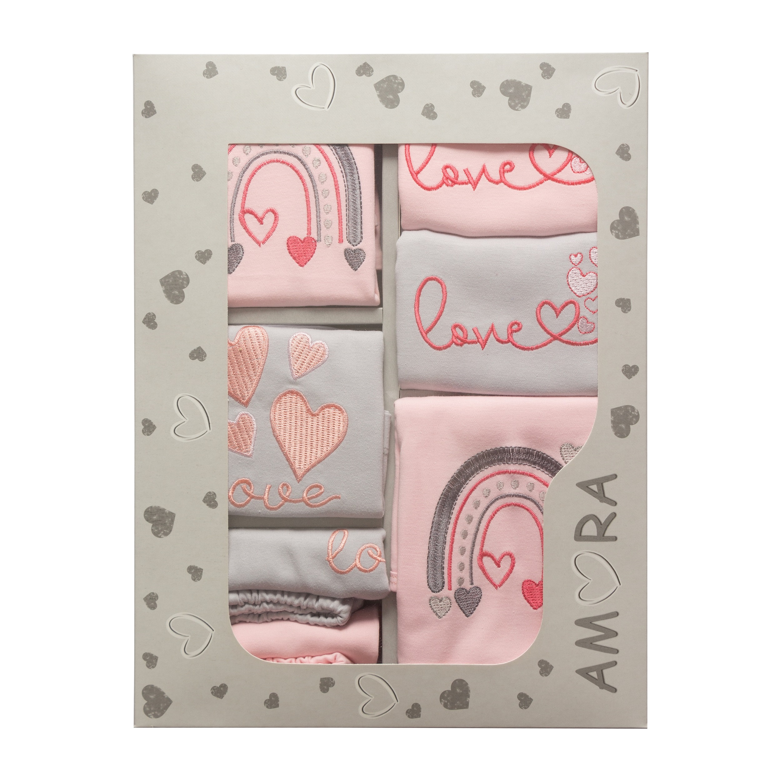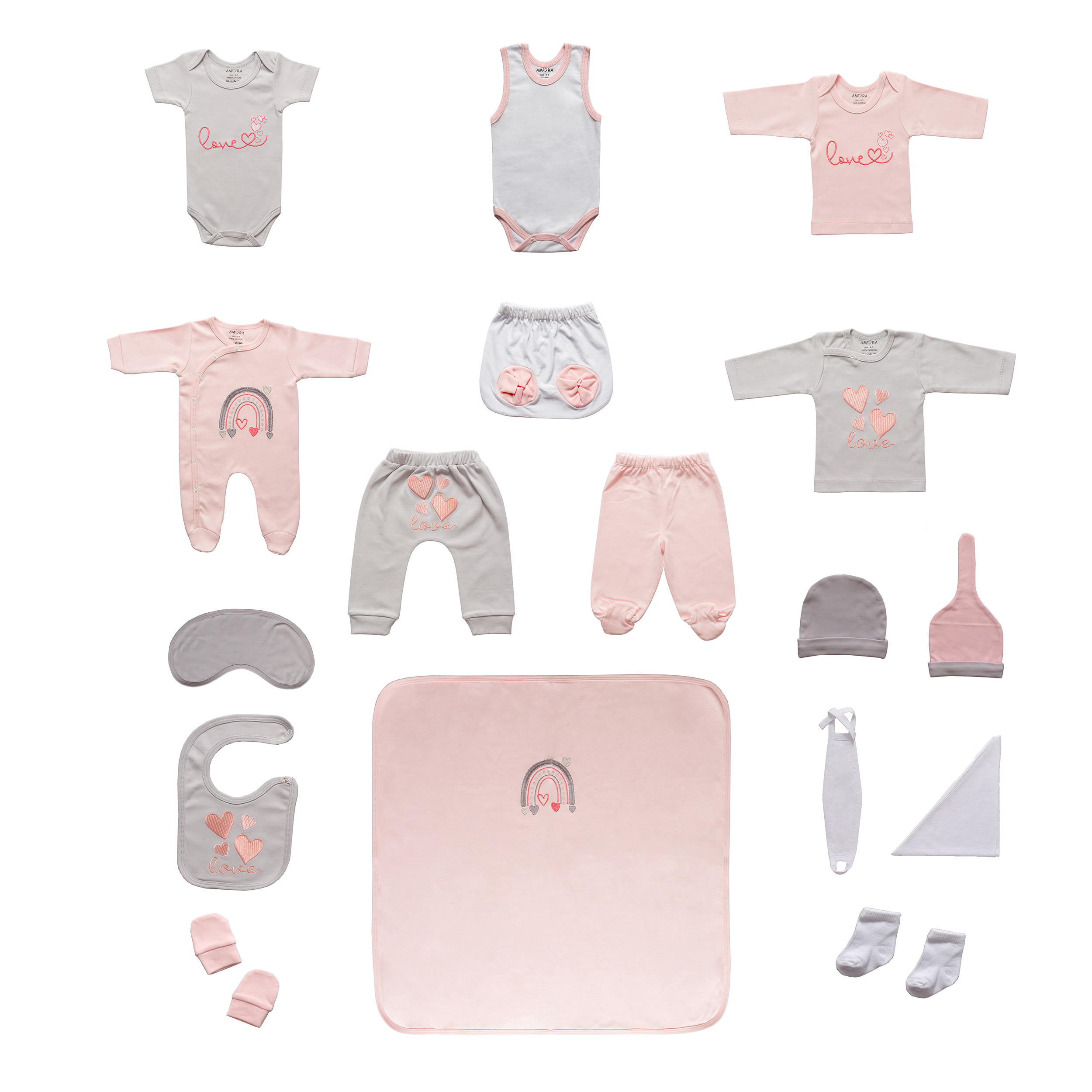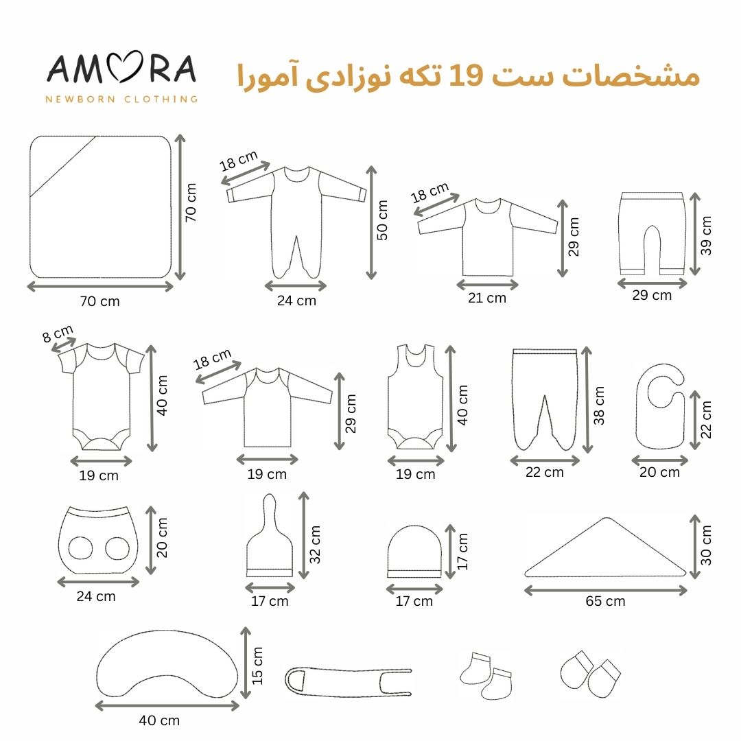 کامل ترین ست 19 تیکه نوزادی بیمارستانی برند آمورا که از پارچه صد در صد پنبه کاملا ضد حساسیت و مناسب چهار فصل سال تولید شده است. این ست مناسب همه نوزادان خصوصا نوزادان با پوست حساس تر می باشد که در تولید آن از هیچ نوع رنگ مصنوعی که باعث ایجاد هرگونه حساسیت خواهد شد, استفاده نشده است. رنگ این محصول کاملا ضد گیاهی می باشد و گلدوزیهای آن با استفاده از نخ های ضد حساسیت انجام شده است و برای جلوگیری از ایجاد التهاب در اثر سایش, یک پارچه مخصوص پشت گلدوزیها دوخته شده است که مانع از تماس آنها با پوست کودک می شود. این مجموعه 19 تکه بیمارستانی تمامی نیازهای ابتدایی نوزادان در بیمارستان و تا 3 ماهگی در منزل را برآورده می کند. تکه های این مجموعه شامل: 1- بلوز 2- شلوار فانتزی 3- شلوار جوراب دار 4- سرهمی جوراب دار 5- بادی آستین کوتاه 6- بادی آستین بلند 7- رکابی زیر دکمه 8- شورت عینکی 9- کلاه گرد 10- کلاه فانتزی 11- پیش بند 12- آروغ گیر 13- یک جفت دستکش 14- یک جفت جوراب 15- روسری ( دستمال ) 16- ناف بند 17- پتو کلاه دار ( که با توجه به ابعاد آن تا 2 سالگی قابلیت استفاده دارد ).