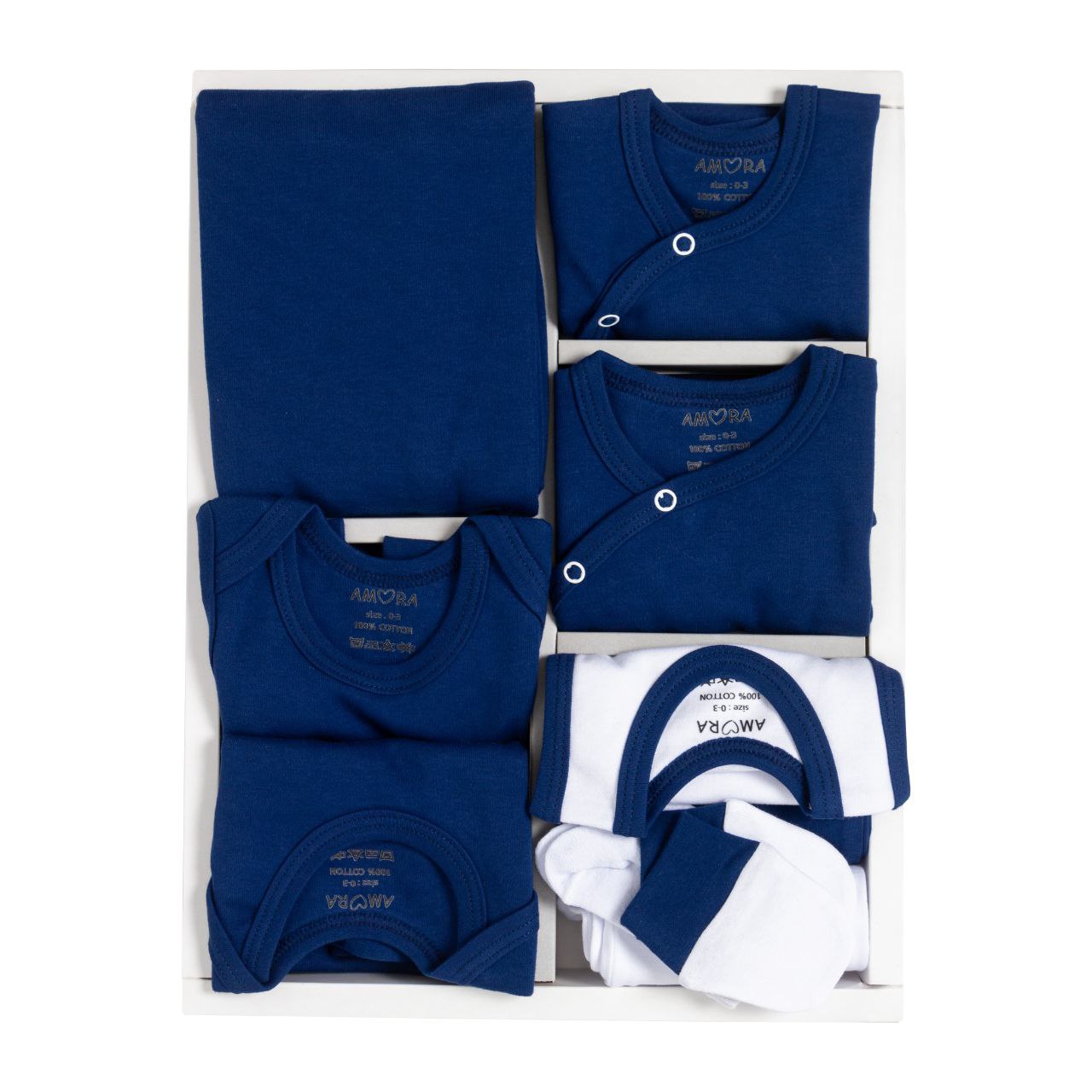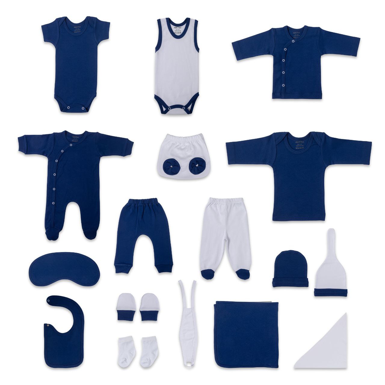 کامل ترین ست 19 تیکه نوزادی بیمارستانی محصول برند آمورا که از پارچه صد در صد پنبه کاملا ضد حساسیت  و مناسب چهار فصل سال تولید شده است. این ست مناسب همه نوزادان خصوصا نوزادان با پوست حساس تر می باشد که در تولید آن از هیچ نوع رنگ مصنوعی و یا گلدوزی و یا تزیینات اضافه که باعث ایجاد هرگونه حساسیت خواهد شد, استفاده نشده است. رنگ سفید این محصول, بر اساس پیشنهاد پزشکان, مناسب ترین رنگ لباس برای نوزادانی است که تازه متولد شده اند. این مجموعه 19 تکه بیمارستانی به عنوان کاملترین مجموعه تولیدی برند آمورا تمامی نیازهای ابتدایی نوزادان در بیمارستان و تا 3 ماهگی در منزل را برآورده می کند و مادران را از خرید هرگونه پوشاک دیگری بی نیاز میکند. تکه های این مجموعه شامل: 1- بلوز 2- شلوار فانتزی 3- شلوار جوراب دار 4- سرهمی جوراب دار 5- بادی آستین کوتاه 6- بادی آستین بلند 7- رکابی زیر دکمه 8- شورت عینکی 9- کلاه گرد  10- کلاه فانتزی 11- پیش بند 12- آروغ گیر 13- یک جفت دستکش 14- یک جفت جوراب 15- روسری ( دستمال ) 16- ناف بند 17- پتو کلاه دار ( که با توجه به ابعاد آن تا 2 سالگی قابلیت استفاده دارد ).