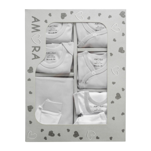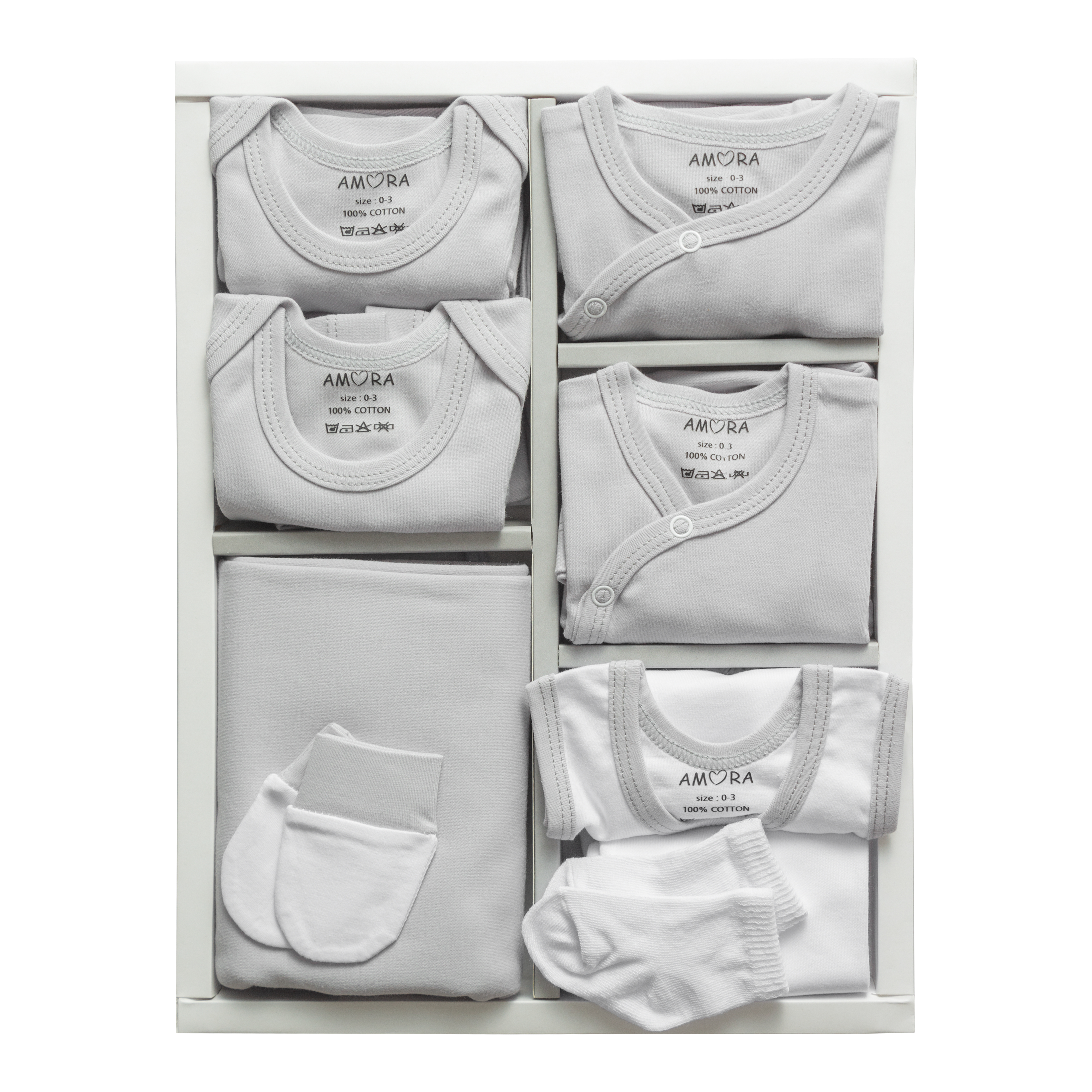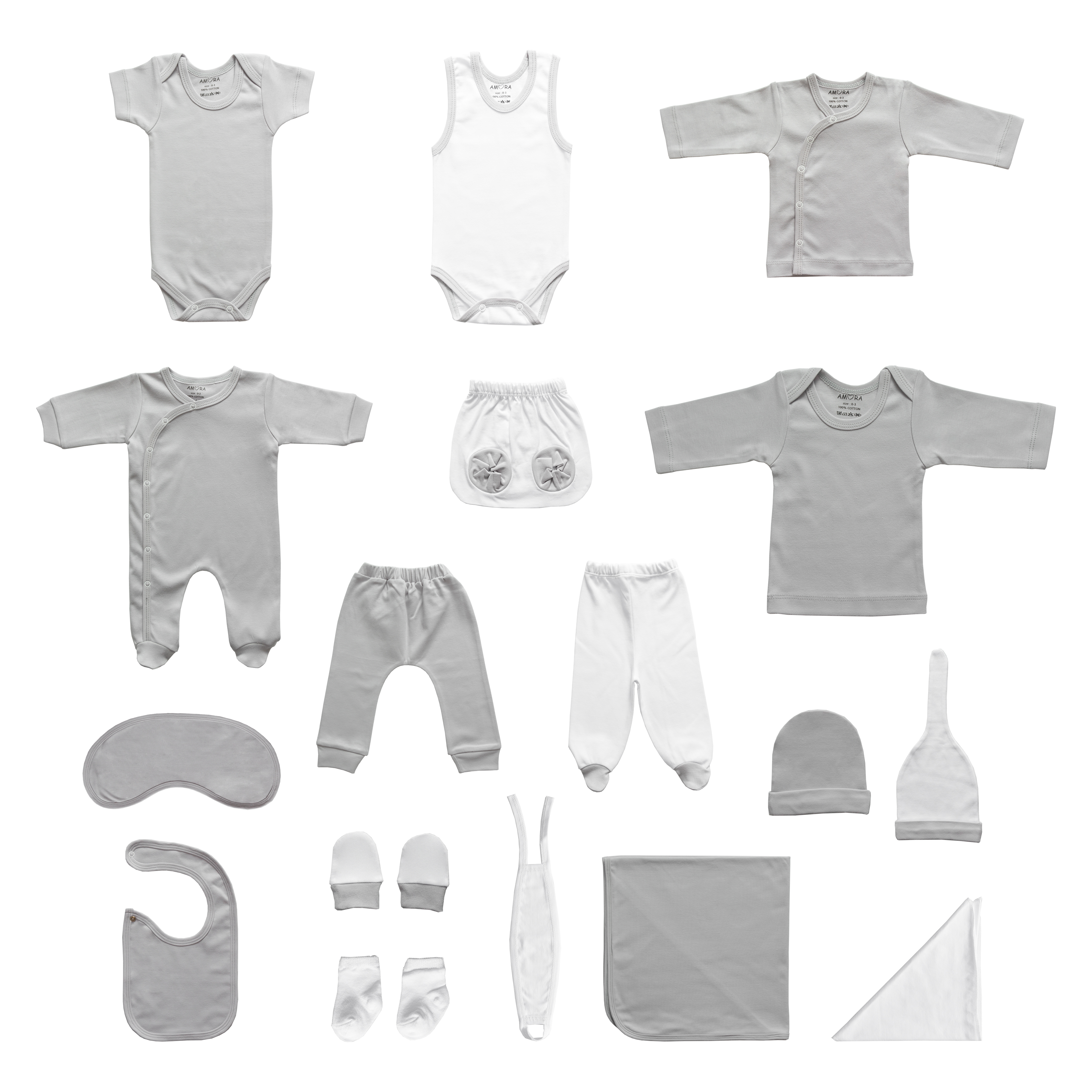 کامل ترین ست 19 تیکه نوزادی بیمارستانی محصول برند آمورا که از پارچه صد در صد پنبه کاملا ضد حساسیت و مناسب چهار فصل سال تولید شده است. این ست مناسب همه نوزادان خصوصا نوزادان با پوست حساس تر می باشد که در تولید آن از هیچ نوع رنگ مصنوعی و یا گلدوزی و یا تزیینات اضافه که باعث ایجاد هرگونه حساسیت خواهد شد, استفاده نشده است. این مجموعه 19 تکه بیمارستانی به عنوان کاملترین مجموعه تولیدی برند آمورا تمامی نیازهای ابتدایی نوزادان در بیمارستان و تا 3 ماهگی در منزل را برآورده می کند و مادران را از خرید هرگونه پوشاک دیگری بی نیاز میکند. تکه های این مجموعه شامل: 1- بلوز 2- شلوار فانتزی 3- شلوار جوراب دار 4- سرهمی جوراب دار 5- بادی آستین کوتاه 6- بادی آستین بلند 7- رکابی زیر دکمه 8- شورت عینکی 9- کلاه گرد 10- کلاه فانتزی 11- پیش بند 12- آروغ گیر 13- یک جفت دستکش 14- یک جفت جوراب 15- روسری ( دستمال ) 16- ناف بند 17- پتو کلاه دار ( که با توجه به ابعاد آن تا 2 سالگی قابلیت استفاده دارد ).