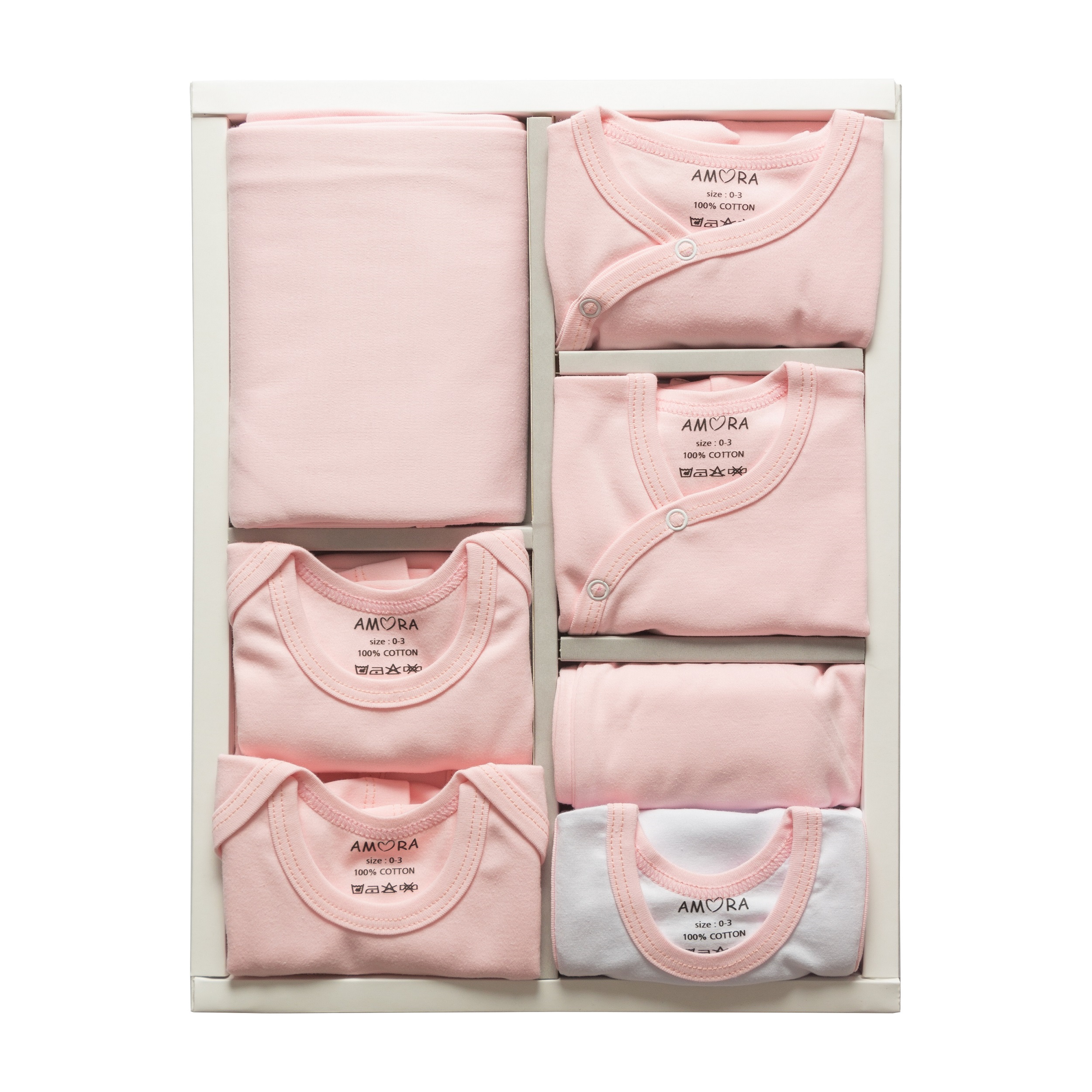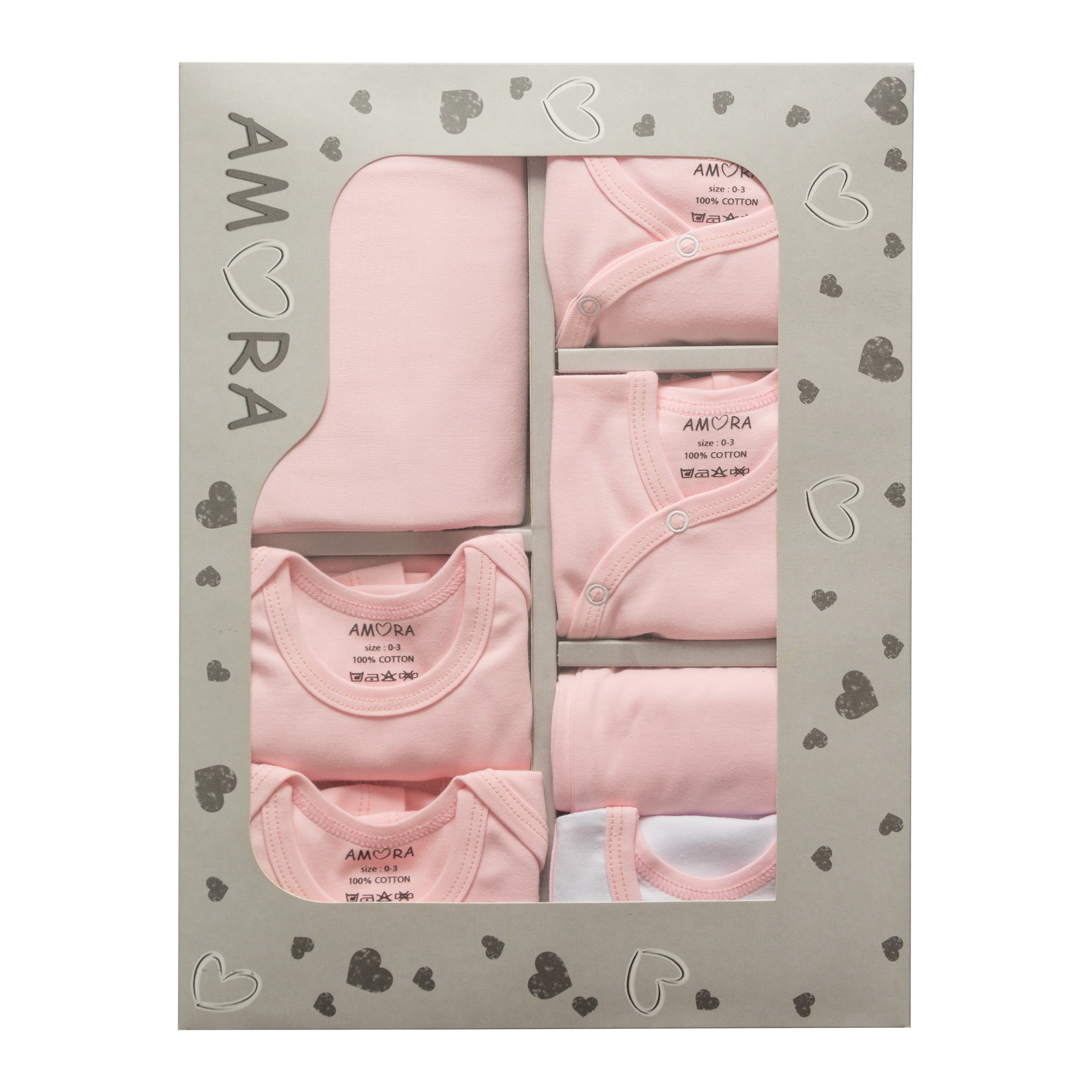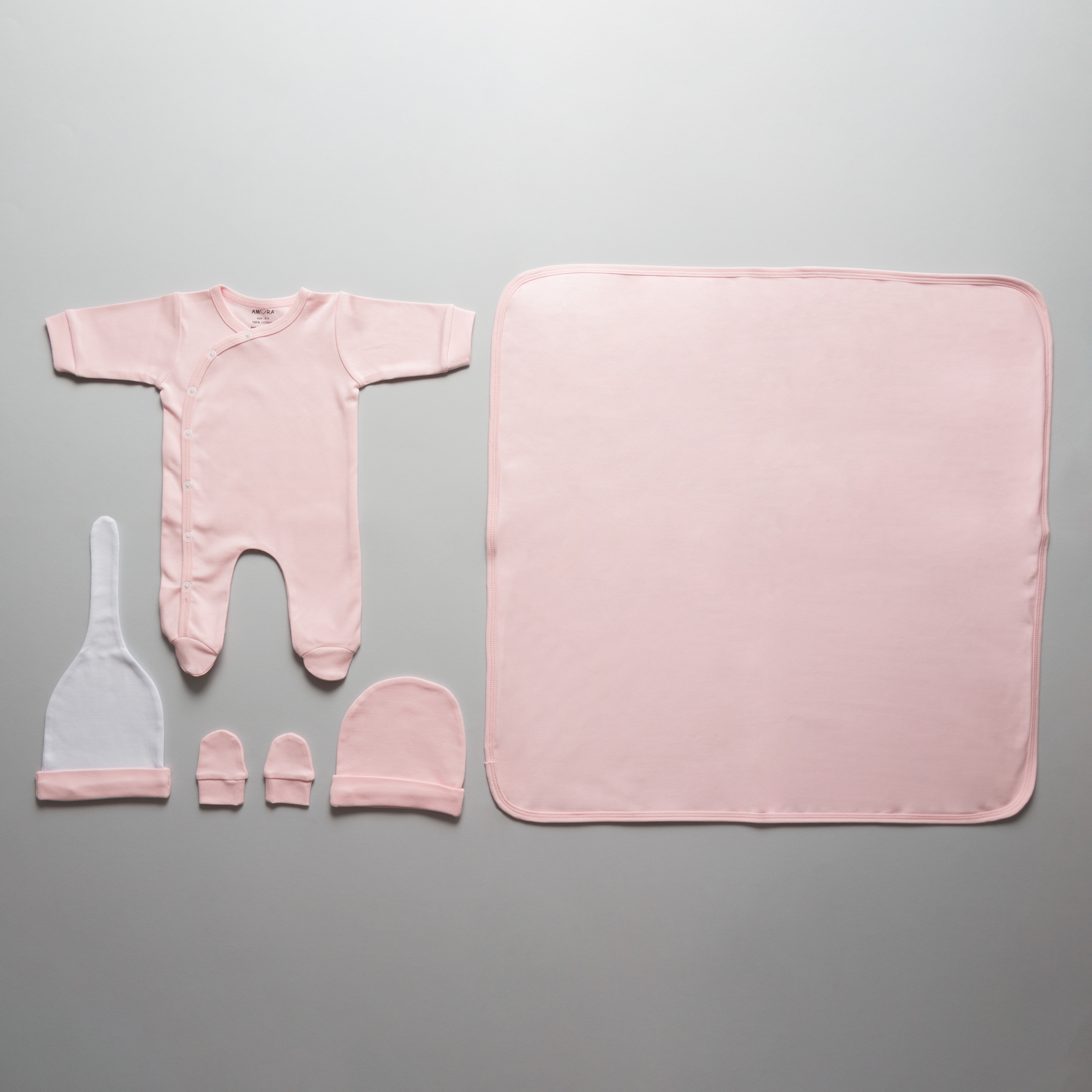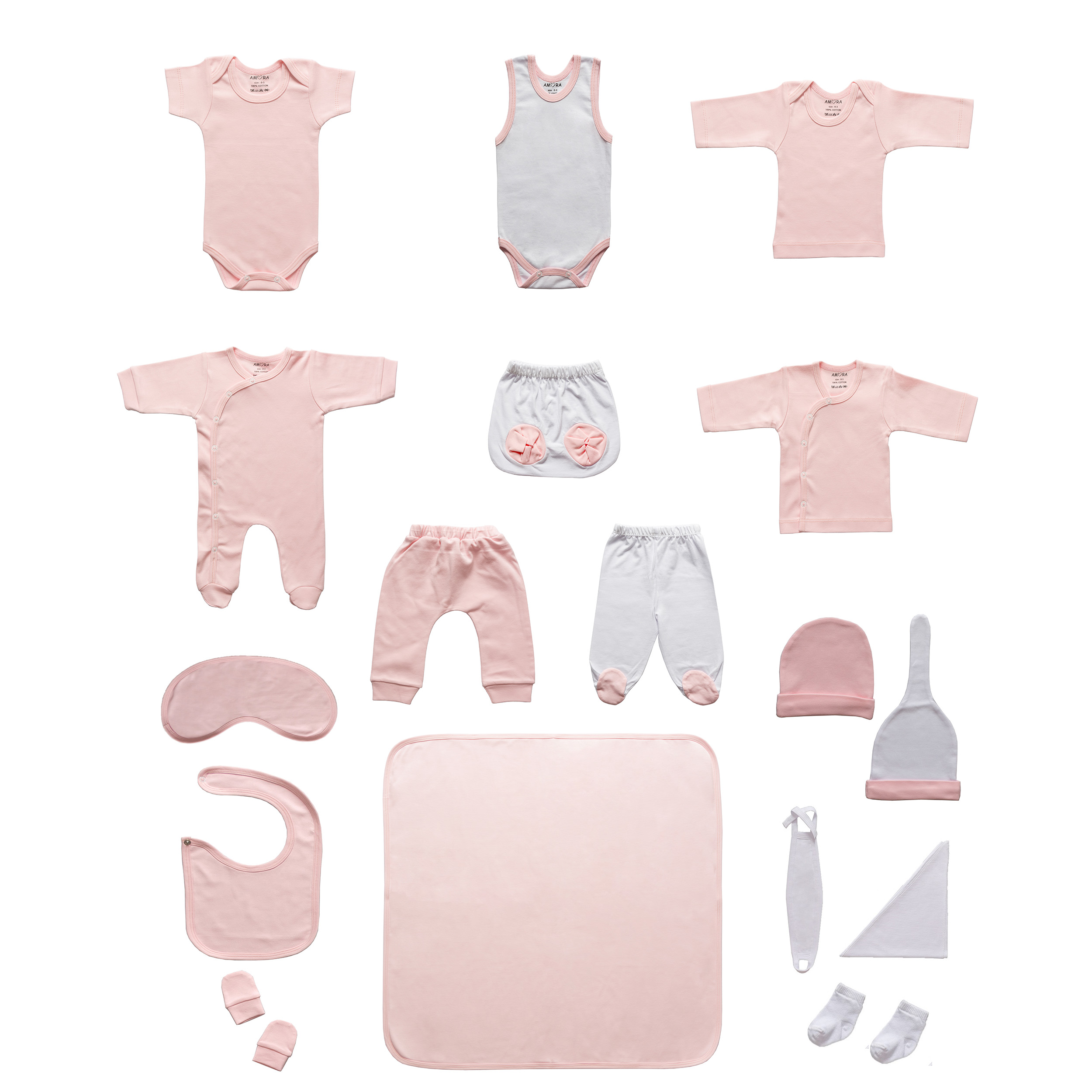 کامل ترین ست 19 تیکه نوزادی بیمارستانی محصول برند آمورا که از پارچه صد در صد پنبه کاملا ضد حساسیت  و مناسب چهار فصل سال تولید شده است. این ست مناسب همه نوزادان خصوصا نوزادان با پوست حساس تر می باشد که در تولید آن از هیچ نوع رنگ مصنوعی و یا گلدوزی و یا تزیینات اضافه که باعث ایجاد هرگونه حساسیت خواهد شد, استفاده نشده است.  این مجموعه 19 تکه بیمارستانی به عنوان کاملترین مجموعه تولیدی برند آمورا تمامی نیازهای ابتدایی نوزادان در بیمارستان و تا 3 ماهگی در منزل را برآورده می کند و مادران را از خرید هرگونه پوشاک دیگری بی نیاز میکند. تکه های این مجموعه شامل: 1- بلوز 2- شلوار فانتزی 3- شلوار جوراب دار 4- سرهمی جوراب دار 5- بادی آستین کوتاه 6- بادی آستین بلند 7- رکابی زیر دکمه 8- شورت عینکی 9- کلاه گرد  10- کلاه فانتزی 11- پیش بند 12- آروغ گیر 13- یک جفت دستکش 14- یک جفت جوراب 15- روسری ( دستمال ) 16- ناف بند 17- پتو کلاه دار ( که با توجه به ابعاد آن تا 2 سالگی قابلیت استفاده دارد ).
