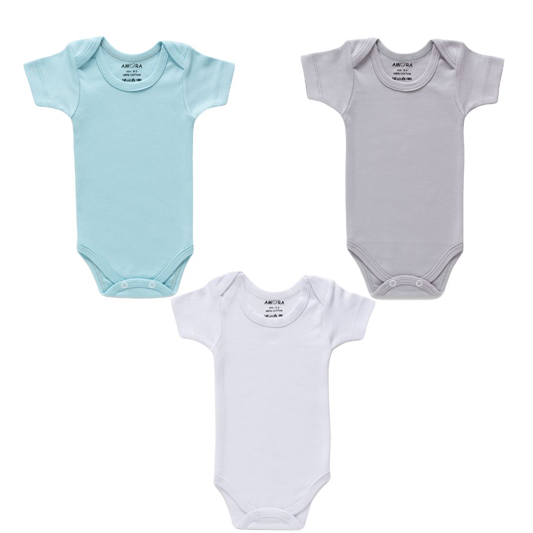 مجموعه 3 عددی بادی نوزادی آستین کوتاه پسرانه آمورا مدل plain در سه رنگ سفید-آبی-طوسی با جنس صد در صد پنبه و کاملا ضد حساسیت که بر اساس انتخاب سایز صحیح, مناسب نوزادان از بدو تولد تا یک سالگی می باشد. از ویژگی های محصولات آمورا استفاده از طراحی استاندارد, متناسب با آناتومی بدن کودک است که توسط تیمی از مشاورین پزشکی, روانشناسی و طراحان لباس مطابق با آخرین متدهای طراحی و دوخت انجام میشود. هم چنین پارچه و رنگهای استفاده شده در این محصولات کاملا در برابر شستشوی زیاد مقاوم بوده و از ثبات و کیفیت بالایی برخوردار است. محصولات آمورا با توجه به حساسیت زیاد پوست و سلامت نوزادان, به صورت کاملا بهداشتی تولید و بسته بندی میگردد تا سلامت دلبندان شما به خطر نیافتد