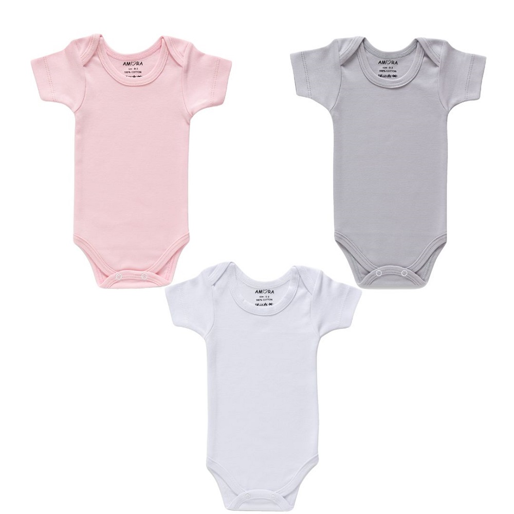 مجموعه 3 عددی بادی نوزادی آستین کوتاه دخترانه آمورا مدل plain در سه رنگ سفید-صورتی-طوسی با جنس صد در صد پنبه و کاملا ضد حساسیت که بر اساس انتخاب سایز صحیح, مناسب نوزادان از بدو تولد تا یک سالگی می باشد. از ویژگی های محصولات آمورا استفاده از طراحی استاندارد, متناسب با آناتومی بدن کودک است که توسط تیمی از مشاورین پزشکی, روانشناسی و طراحان لباس مطابق با آخرین متدهای طراحی و دوخت انجام میشود. هم چنین پارچه و رنگهای استفاده شده در این محصولات کاملا در برابر شستشوی زیاد مقاوم بوده و از ثبات و کیفیت بالایی برخوردار است. محصولات آمورا با توجه به حساسیت زیاد پوست و سلامت نوزادان, به صورت کاملا بهداشتی تولید و بسته بندی میگردد تا سلامت دلبندان شما به خطر نیافتد