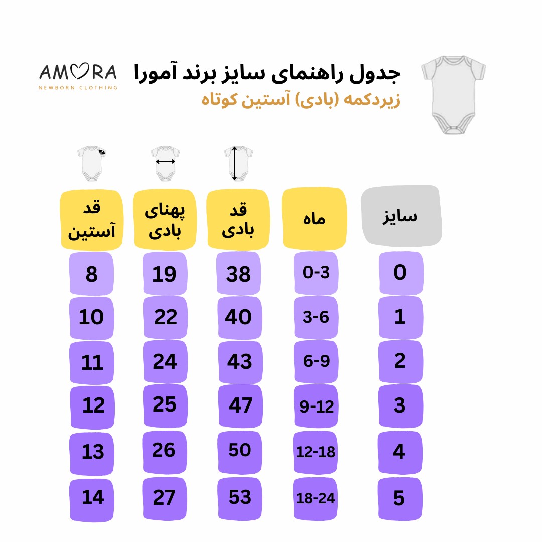 بادی نوزادی آستین کوتاه طوسی آمورا مدل plain با جنس صد در صد پنبه و کاملا ضد حساسیت که بر اساس انتخاب سایز صحیح, مناسب نوزادان از بدو تولد تا یک سالگی می باشد. از ویژگی های محصولات آمورا استفاده از طراحی استاندارد متناسب با آناتومی بدن کودک می باشد که توسط تیمی از مشاورین پزشکی, روانشناسی و طراحان لباس مطابق با آخرین متدهای طراحی و دوخت انجام می شود. هم چنین پارچه و رنگهای استفاده شده در این محصولات کاملا در برابر شستشوی زیاد مقاوم بوده و از ثبات و کیفیت بالایی برخوردار است. محصولات آمورا با توجه به حساسیت زیاد پوست و سلامت نوزادان, به صورت کاملا بهداشتی تولید و بسته بندی میگردد تا سلامت دلبندان شما به خطر نیافتد. جهت اطلاع از نحوه شستشو, لطفا به علامتهای شستشو روی بسته بندی محصول توجه فرمایید.
